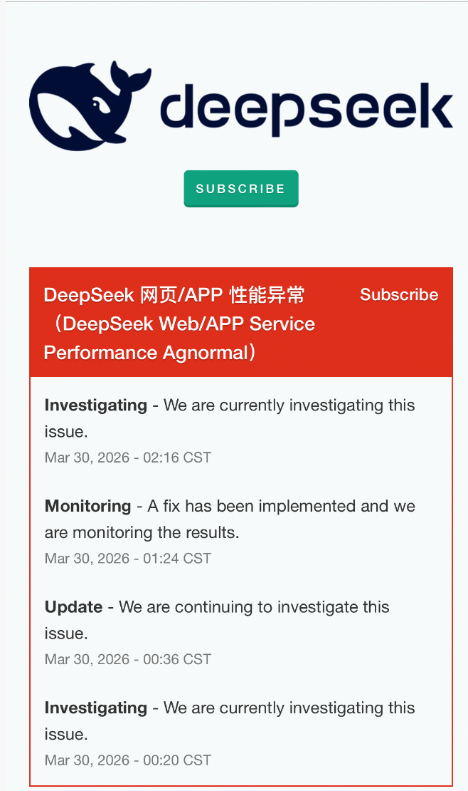 截至发稿,DeepSeek官方尚未发布正式故障说明及原因解释。DeepSeek官网显示,3月30日00:20至2:16期间,DeepSeek页面显示“目前正在调查此问题”、“正在继续调查此问题”、“已实施修复措施,我们正在监控结果”、“我们目前正在调查此问题”。